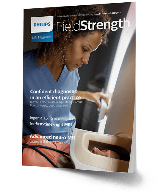 FieldStrength MRI articles, FieldStrength MRI newsletter, and FieldStrength MRI magazine are produced by Philips Healthcare for the Philips MRI user community. Some articles may describe research conducted outside the USA on equipment not yet available for commercial distribution in the USA. Some products referenced may not be licensed for sale in Canada.